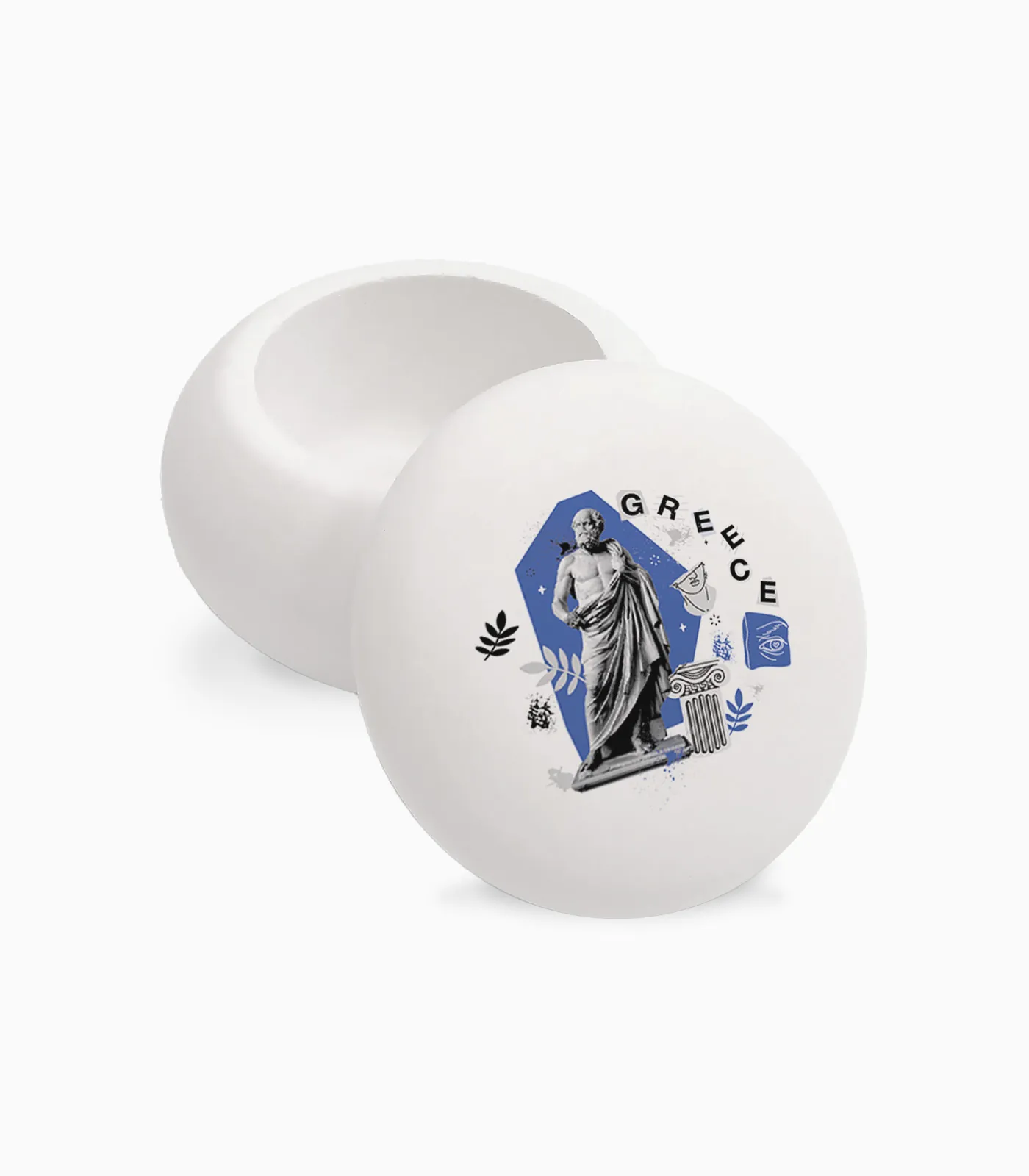 Με καθαρές γραμμές και διακριτικό σχήμα μακαρόν, το βαζάκι προσφέρει μια μοντέρνα αισθητική που ξεφεύγει από τα κλασικά τουριστικά αντικείμενα. Ανήκει στη θεματική Folklore, προτείνοντας μια πιο σύγχρονη προσέγγιση στον χώρο των αναμνηστικών δώρων.