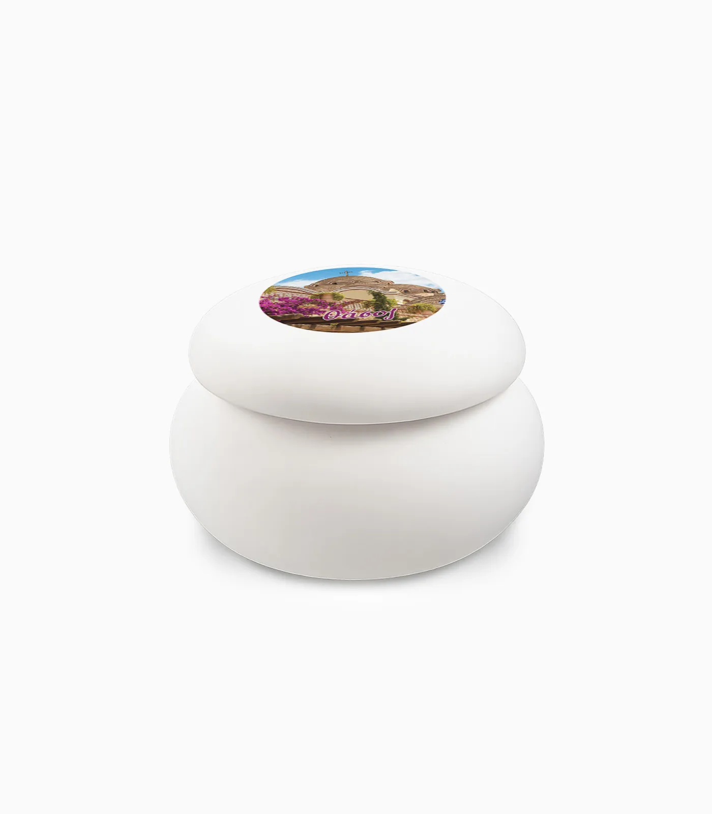 Με καθαρές γραμμές και διακριτικό σχήμα μακαρόν, το βαζάκι προσφέρει μια μοντέρνα αισθητική που ξεφεύγει από τα κλασικά τουριστικά αντικείμενα. Ανήκει στη θεματική Folklore, προτείνοντας μια πιο σύγχρονη προσέγγιση στον χώρο των αναμνηστικών δώρων.