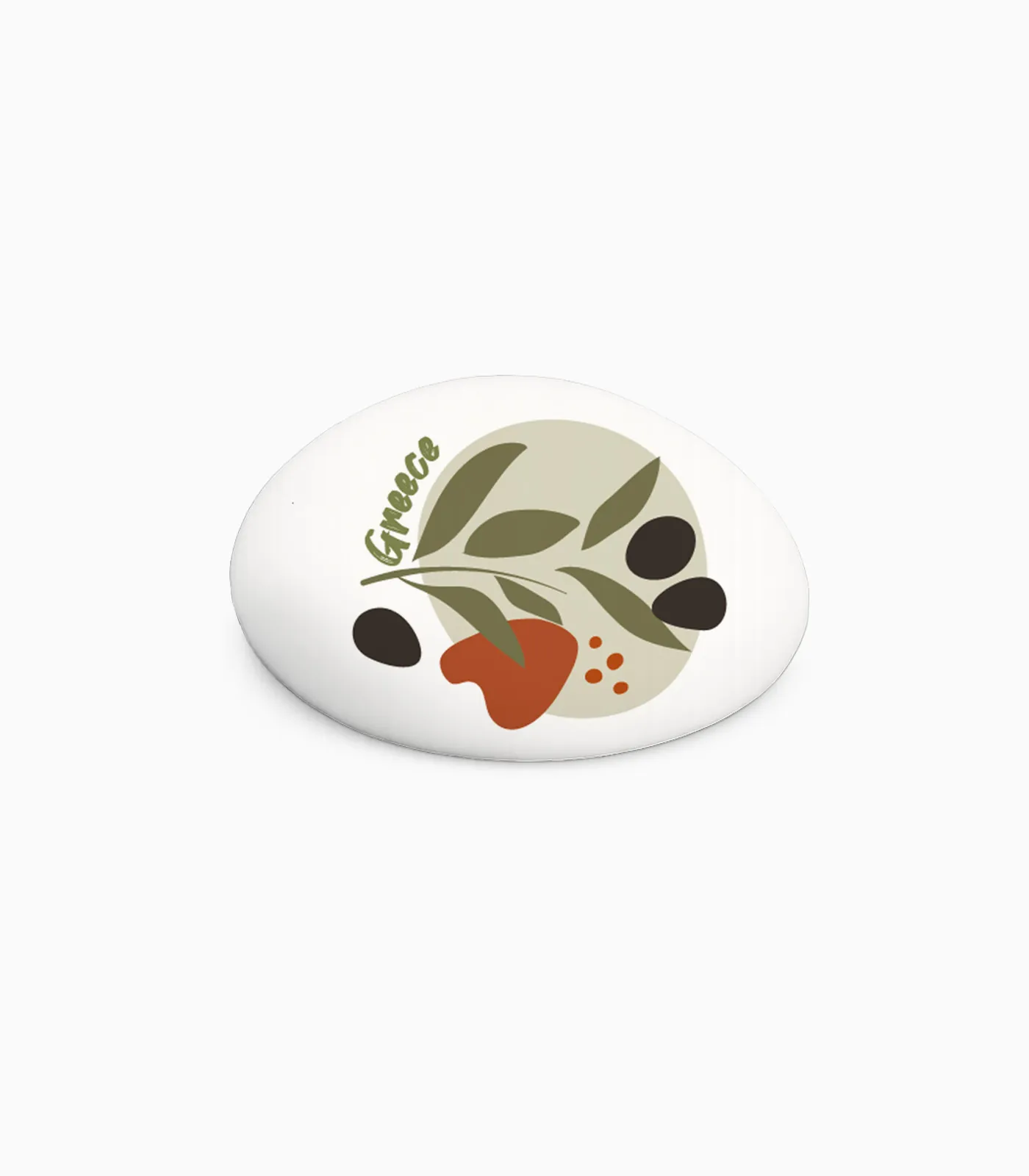 Το στρογγυλό σχήμα τύπου βότσαλο δημιουργεί μια οργανική και φυσική εικόνα, ιδανική για ανάδειξη θεμάτων πολιτιστικού ή τοπικού χαρακτήρα. Η καθαρή επιφάνεια επιτρέπει την ευκρινή προβολή του σχεδίου, καθιστώντας το μαγνητάκι κατάλληλο για συλλογές souvenir με minimal αισθητική.
